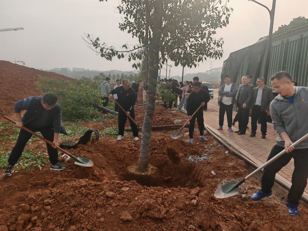 随后,全体党员在校园绿化区开展义务植树活动。大家分工协作、默契配合,挥锹铲土、扶苗填坑、提水浇灌,经过近两个小时的努力,树苗在春风中昂然挺立,为新校区增添了一抹生机勃勃的绿色。